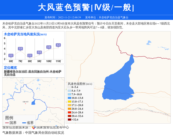 木垒哈萨克自治县气象台2022年11月23日12时0分发布大风蓝色预警信号:预计今日白天至夜间,木垒县大部地区将出现6~7级西北风,其中北部雀仁乡至大东山及南部四道沟至大石头乡一带局地阵风可达7~8级,请加强防范。 信息来源:国家预警信息发布中心; 发布单位:木垒哈萨克自治县气象台。