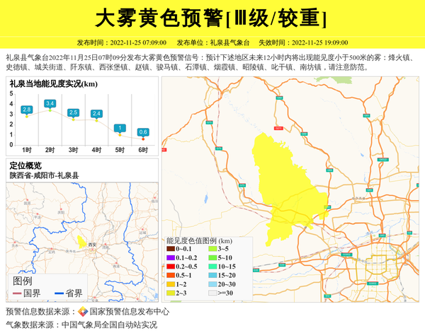 礼泉县气象台2022年11月25日07时09分发布大雾黄色预警信号:预计下述地区未来12小时内将出现能见度小于500米的雾:烽火镇、史德镇、城关街道、阡东镇、西张堡镇、赵镇、骏马镇、石潭镇、烟霞镇、昭陵镇、叱干镇、南坊镇,请注意防范。 信息来源:国家预警信息发布中心; 发布单位:礼泉县气象台。