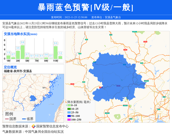 安溪县气象台2022年11月25日12时50分继续发布暴雨蓝色预警信号:过去12小时我县普降大雨,预计未来12小时我县局部乡镇降水可达50毫米以上,请注意防范持续性降水引发的城乡积涝、山体滑坡等次生灾害! 信息来源:国家预警信息发布中心; 发布单位:安溪县气象台。