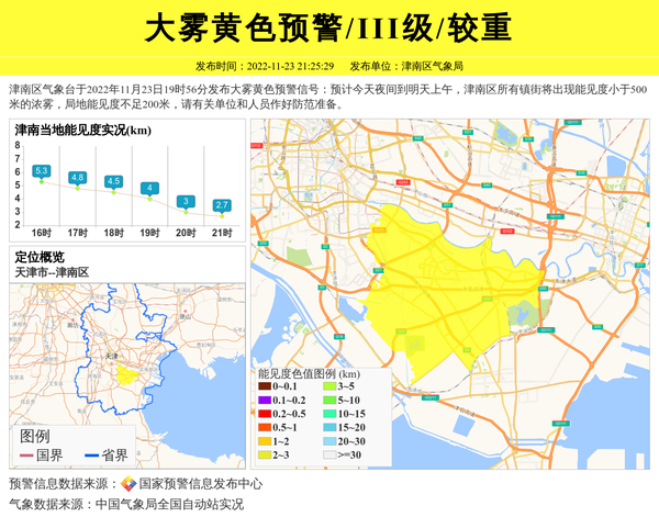 津南区气象台于2022年11月23日19时56分发布大雾黄色预警信号:预计今天夜间到明天上午,津南区所有镇街将出现能见度小于500米的浓雾,局地能见度不足200米,请有关单位和人员作好防范准备。 信息来源:国家预警信息发布中心; 发布单位:津南区气象局。