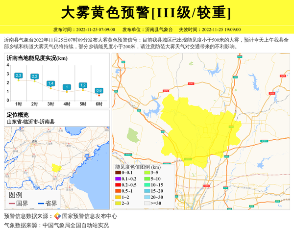 沂南县气象台2022年11月25日07时09分发布大雾黄色预警信号:目前我县城区已出现能见度小于500米的大雾,预计今天上午我县全部乡镇和街道大雾天气仍将持续,部分乡镇能见度小于200米,请注意防范大雾天气对交通带来的不利影响。 信息来源:国家预警信息发布中心; 发布单位:沂南县气象台。