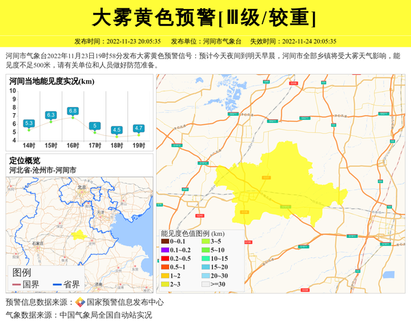 河间市气象台2022年11月23日19时58分发布大雾黄色预警信号:预计今天夜间到明天早晨,河间市全部乡镇将受大雾天气影响,能见度不足500米,请有关单位和人员做好防范准备。 信息来源:国家预警信息发布中心; 发布单位:河间市气象台。