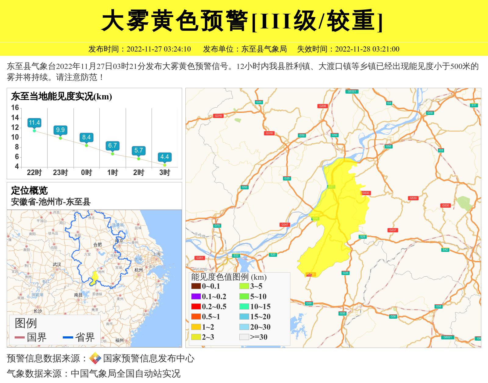 东至县气象台2022年11月27日03时21分发布大雾黄色预警信号。12小时内我县胜利镇、大渡口镇等乡镇已经出现能见度小于500米的雾并将持续。请注意防范! 信息来源:国家预警信息发布中心; 发布单位:东至县气象局。