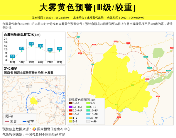 永顺县气象台2022年11月25日22时29分发布大雾黄色预警信号:预计永顺县25日夜间至26日上午将出现能见度不足500米的雾,请注意防范。 信息来源:国家预警信息发布中心; 发布单位:永顺县气象局。