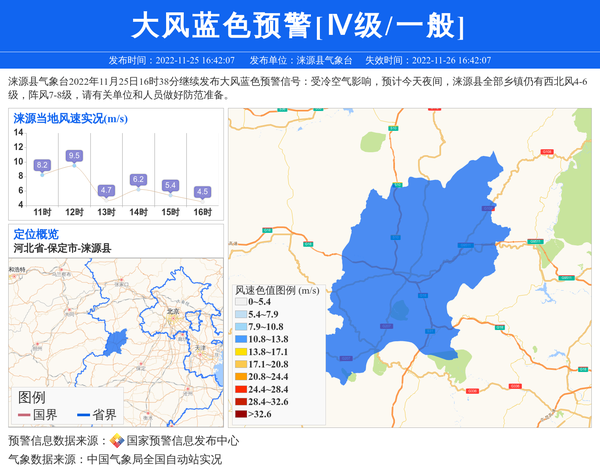 涞源县气象台2022年11月25日16时38分继续发布大风蓝色预警信号:受冷空气影响,预计今天夜间,涞源县全部乡镇仍有西北风4-6级,阵风7-8级,请有关单位和人员做好防范准备。 信息来源:国家预警信息发布中心; 发布单位:涞源县气象台。
