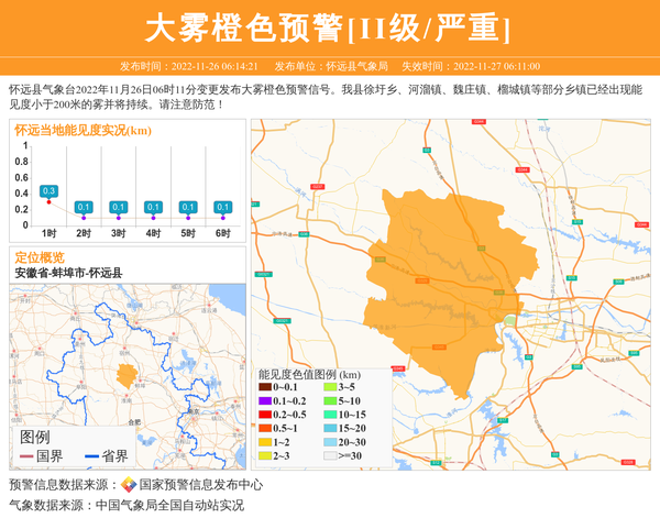 怀远县气象台2022年11月26日06时11分变更发布大雾橙色预警信号。我县徐圩乡、河溜镇、魏庄镇、榴城镇等部分乡镇已经出现能见度小于200米的雾并将持续。请注意防范! 信息来源:国家预警信息发布中心; 发布单位:怀远县气象局。