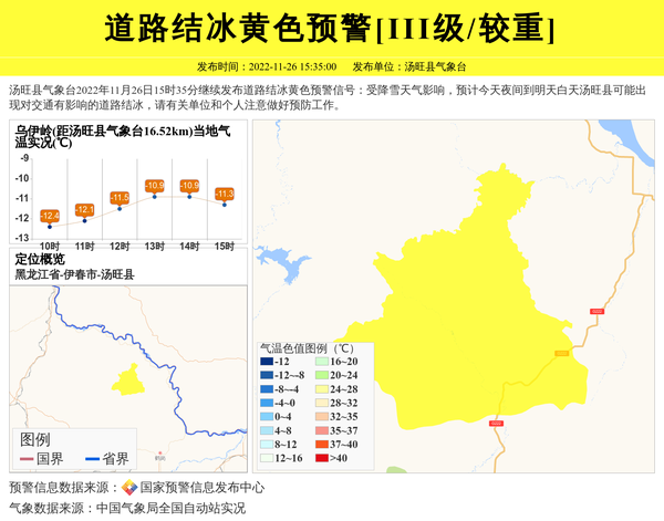 汤旺县气象台2022年11月26日15时35分继续发布道路结冰黄色预警信号:受降雪天气影响,预计今天夜间到明天白天汤旺县可能出现对交通有影响的道路结冰,请有关单位和个人注意做好预防工作。 信息来源:国家预警信息发布中心; 发布单位:汤旺县气象台。