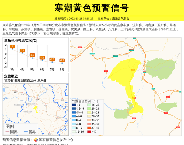 康乐县气象台2022年11月28日08时18分发布寒潮黄色预警信号:预计未来24小时内我县康丰乡、流川乡、鸣鹿乡、五户乡、草滩乡、附城镇、苏集镇、胭脂镇、景古镇、莲麓镇、虎关乡、白王乡、八松乡、八丹乡、上湾乡部分地方最低气温将下降10℃以上,且最低气温下降至-12℃以下,将出现寒潮,请注意防范。 信息来源:国家预警信息发布中心; 发布单位:康乐县气象台。