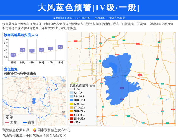 汝南县气象台2022年11月27日18时04分发布大风蓝色预警信号:预计未来24小时内,我县三门闸街道、王岗镇、金铺镇等全部乡镇和街道将出现5到6级偏北风,阵风7级以上,请注意防范。 信息来源:国家预警信息发布中心; 发布单位:汝南县气象局。