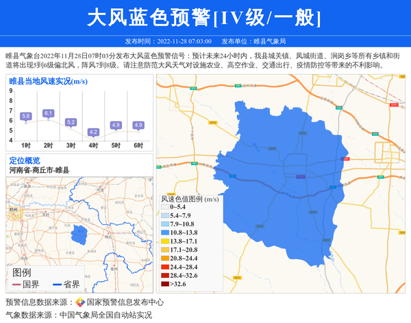 睢县气象台2022年11月28日07时03分发布大风蓝色预警信号:预计未来24小时内,我县城关镇、凤城街道、涧岗乡等所有乡镇和街道将出现5到6级偏北风,阵风7到8级。请注意防范大风天气对设施农业、高空作业、交通出行、疫情防控等带来的不利影响。 信息来源:国家预警信息发布中心; 发布单位:睢县气象局。