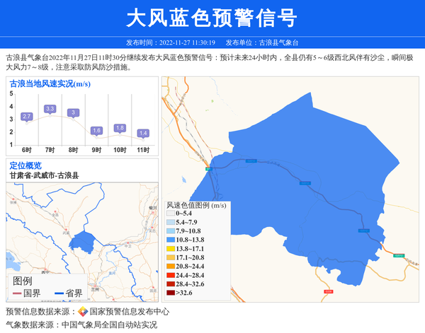 古浪县气象台2022年11月27日11时30分继续发布大风蓝色预警信号:预计未来24小时内,全县仍有5~6级西北风伴有沙尘,瞬间极大风力7~8级,注意采取防风防沙措施。 信息来源:国家预警信息发布中心; 发布单位:古浪县气象台。