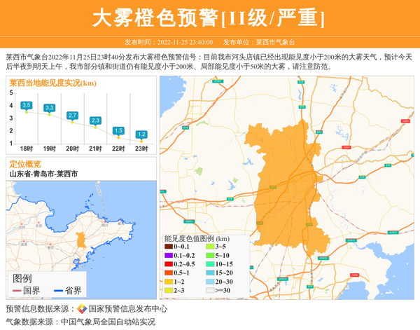 莱西市气象台2022年11月25日23时40分发布大雾橙色预警信号:目前我市河头店镇已经出现能见度小于200米的大雾天气,预计今天后半夜到明天上午,我市部分镇和街道仍有能见度小于200米、局部能见度小于50米的大雾,请注意防范。 信息来源:国家预警信息发布中心; 发布单位:莱西市气象台。