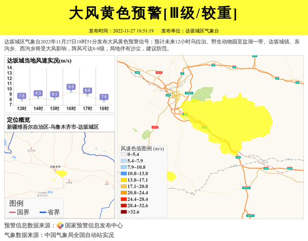 达坂城区气象台2022年11月27日18时51分发布大风黄色预警信号:预计未来12小时乌拉泊、野生动物园至盐湖一带、达坂城镇、东沟乡、西沟乡将受大风影响,阵风可达8-9级,局地伴有沙尘,建议防范。 信息来源:国家预警信息发布中心; 发布单位:达坂城区气象台。