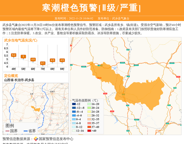 武乡县气象台2022年11月28日10时06分发布寒潮橙色预警信号。预警区域:武乡县所有乡、镇(街道)。受强冷空气影响,预计48小时预警区域内最低气温将下降12℃以上。请有关单位和人员作好防范准备。防御指南:1.政府及有关部门按照职责做好防寒潮应急工作;2.注意防寒保暖。3.农业、水产业、畜牧业等要积极采取防霜冻、冰冻等防寒措施,尽量减少损失。 信息来源:国家预警信息发布中心; 发布单位:武乡县气象台。