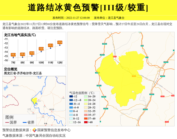 龙江县气象台2022年11月27日12时08分发布道路结冰黄色预警信号:受降雪天气影响,预计27日午后至28日白天,龙江县出现对交通有影响的道路结冰、路面积雪。请注意预防。 信息来源:国家预警信息发布中心; 发布单位:龙江县气象台。