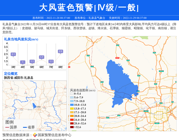 礼泉县气象台2022年11月28日08时37分发布大风蓝色预警信号:预计下述地区未来24小时内将受大风影响,平均风力可达6级以上(阵风7级以上):史德镇、骏马镇、城关街道、阡东镇、西张堡镇、赵镇、烽火镇、石潭镇、烟霞镇、昭陵镇、叱干镇、南坊镇,请注意防范。 信息来源:国家预警信息发布中心; 发布单位:礼泉县气象台。