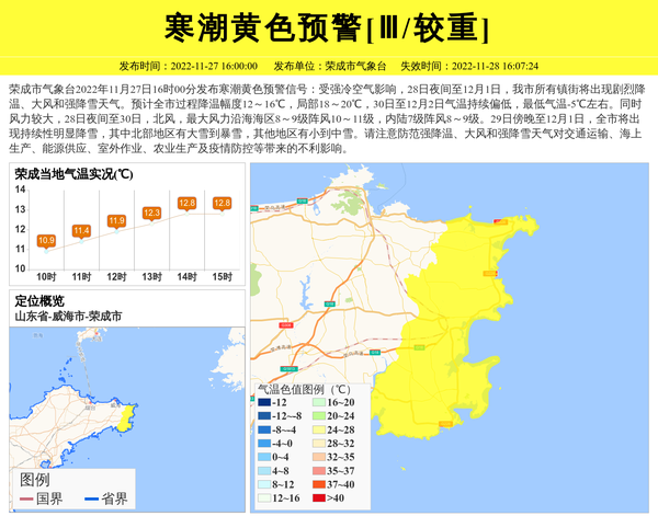 荣成市气象台2022年11月27日16时00分发布寒潮黄色预警信号:受强冷空气影响,28日夜间至12月1日,我市所有镇街将出现剧烈降温、大风和强降雪天气。预计全市过程降温幅度12~16℃,局部18~20℃,30日至12月2日气温持续偏低,最低气温-5℃左右。同时风力较大,28日夜间至30日,北风,最大风力沿海海区8~9级阵风10~11级,内陆7级阵风8~9级。29日傍晚至12月1日,全市将出现持续性明显降雪,其中北部地区有大雪到暴雪,其他地区有小到中雪。请注意防范强降温、大风和强降雪天气对交通运输、海上生产、能源供应、室外作业、农业生产及疫情防控等带来的不利影响。 信息来源:国家预警信息发布中心; 发布单位:荣成市气象台。