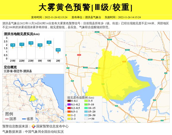 泗洪县气象台2022年11月26日02时14分发布大雾黄色预警信号:目前我县所有乡(镇、街道)已经出现能见度不足500米、局部地区不足200米的浓雾或强浓雾并将持续,能见度较低,县应急、气象联合提醒做好防范。 信息来源:国家预警信息发布中心; 发布单位:泗洪县气象台。