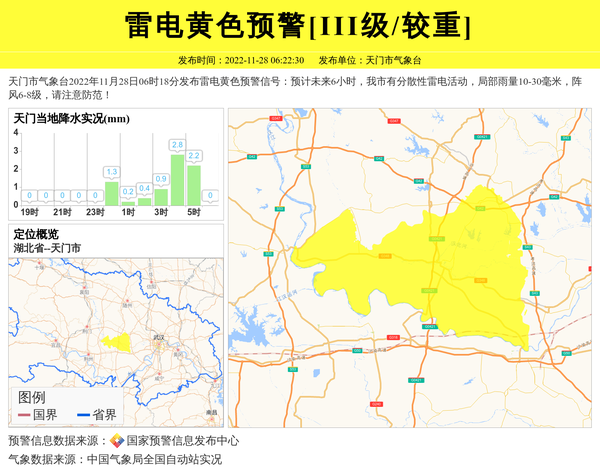 天门市气象台2022年11月28日06时18分发布雷电黄色预警信号:预计未来6小时,我市有分散性雷电活动,局部雨量10-30毫米,阵风6-8级,请注意防范! 信息来源:国家预警信息发布中心; 发布单位:天门市气象台。