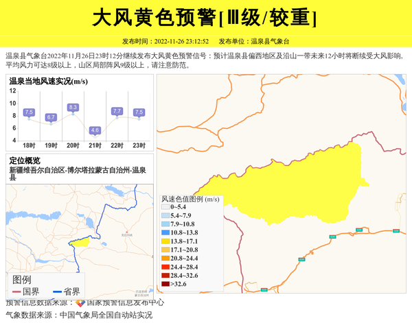 温泉县气象台2022年11月26日23时12分继续发布大风黄色预警信号:预计温泉县偏西地区及沿山一带未来12小时将断续受大风影响,平均风力可达8级以上,山区局部阵风9级以上,请注意防范。 信息来源:国家预警信息发布中心; 发布单位:温泉县气象台。