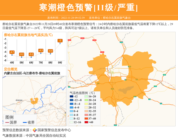 察哈尔右翼前旗气象台2022年11月28日09时48分发布寒潮橙色预警信号:24小时内察哈尔右翼前旗最低气温将要下降12℃以上,29日最低气温下降至-27~-20℃,平均风力5-6级,阵风可达7级以上。请有关单位和人员做好防范准备。 信息来源:国家预警信息发布中心; 发布单位:察哈尔右翼前旗气象台。