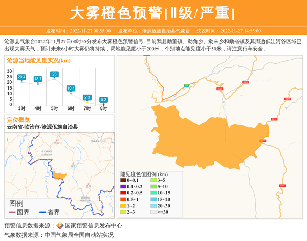 沧源县气象台2022年11月27日08时55分发布大雾橙色预警信号: 目前我县勐董镇、勐角乡、勐来乡和勐省镇及其周边低洼河谷区域已出现大雾天气,预计未来6小时大雾仍将持续,局地能见度小于200米,个别地点能见度小于50米,请注意行车安全。 信息来源:国家预警信息发布中心; 发布单位:沧源佤族自治县气象台。