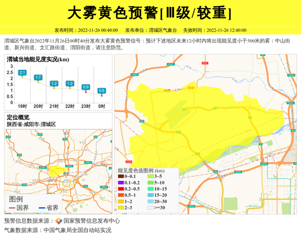 渭城区气象台2022年11月26日00时40分发布大雾黄色预警信号:预计下述地区未来12小时内将出现能见度小于500米的雾:中山街道、新兴街道、文汇路街道、渭阳街道,请注意防范。 信息来源:国家预警信息发布中心; 发布单位:渭城区气象台。