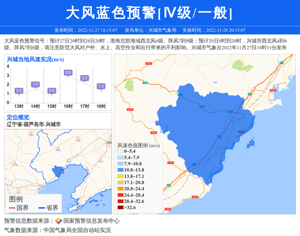 大风蓝色预警信号:预计27日20时到28日20时,渤海北部海域西北风6级、阵风7到9级;预计28日8时到20时,兴城市西北风4到6级、阵风7到8级,请注意防范大风对户外、水上、高空作业和出行带来的不利影响。兴城市气象台2022年11月27日18时11分发布 信息来源:国家预警信息发布中心; 发布单位:兴城市气象局。