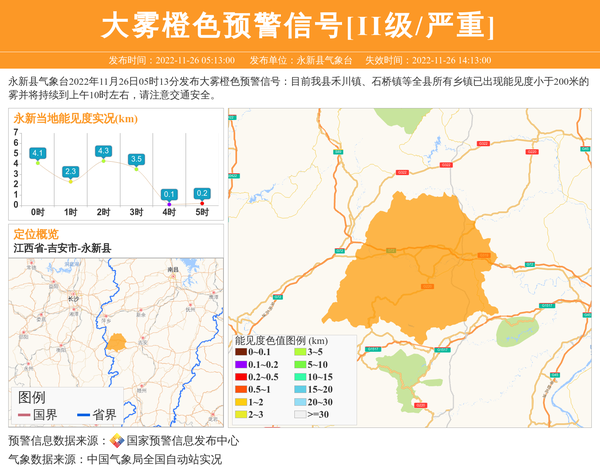 永新县气象台2022年11月26日05时13分发布大雾橙色预警信号:目前我县禾川镇、石桥镇等全县所有乡镇已出现能见度小于200米的雾并将持续到上午10时左右,请注意交通安全。 信息来源:国家预警信息发布中心; 发布单位:永新县气象台。