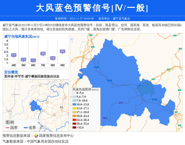 威宁县气象台2022年11月27日10时05分继续发布大风蓝色预警信号:目前,我县雪山、岔河、观风海、双龙、板底等乡镇已经出现6级以上大风,预计未来将持续。请注意做好防风措施,关闭门窗,避免在玻璃门窗、广告牌附近逗留。 信息来源:国家预警信息发布中心; 发布单位:威宁县气象台。