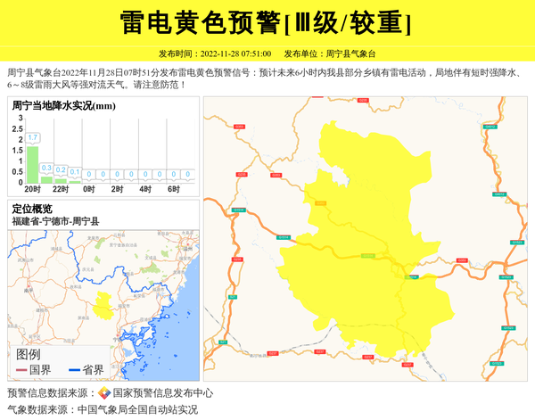 周宁县气象台2022年11月28日07时51分发布雷电黄色预警信号:预计未来6小时内我县部分乡镇有雷电活动,局地伴有短时强降水、6~8级雷雨大风等强对流天气。请注意防范! 信息来源:国家预警信息发布中心; 发布单位:周宁县气象台。