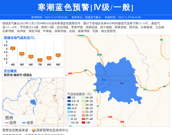 绥德县气象台2022年11月27日09时43分发布寒潮蓝色预警信号:预计下述地区未来48小时内最低气温将下降12~14℃,最低气温-12~-10℃,平均风力5-6级,阵风7-8级:定仙墕镇、枣林坪镇、张家砭镇、四十铺镇、薛家峁镇、田庄镇、白家硷镇、义合镇、石家湾镇、名州镇、满堂川镇、中角镇、薛家河镇、吉镇、崔家湾镇、艽园,请注意防范。 信息来源:国家预警信息发布中心; 发布单位:绥德县气象台。
