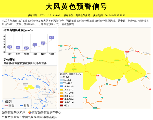 乌兰县气象台11月27日13时40分发布大风黄色预警信号:预计27日13时40分至28日01时40分希里沟镇、茶卡镇、柯柯镇、铜普镇将出现7级以上大风,阵风8级以上,并伴有沙尘天气,请注意防范。 信息来源:国家预警信息发布中心; 发布单位:乌兰县气象局。