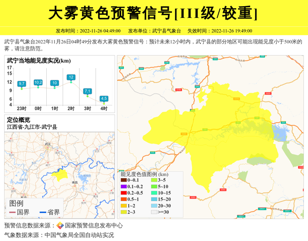 武宁县气象台2022年11月26日04时49分发布大雾黄色预警信号:预计未来12小时内,武宁县的部分地区可能出现能见度小于500米的雾,请注意防范。 信息来源:国家预警信息发布中心; 发布单位:武宁县气象台。