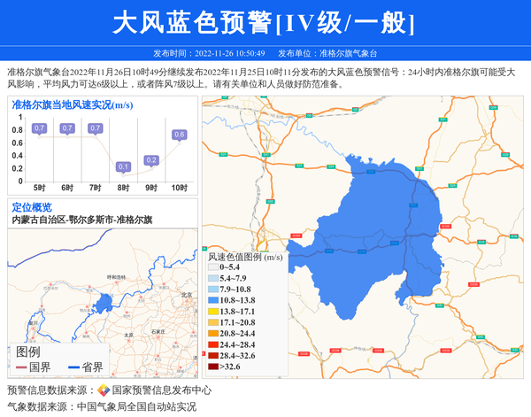 准格尔旗气象台2022年11月26日10时49分继续发布2022年11月25日10时11分发布的大风蓝色预警信号:24小时内准格尔旗可能受大风影响,平均风力可达6级以上,或者阵风7级以上。请有关单位和人员做好防范准备。 信息来源:国家预警信息发布中心; 发布单位:准格尔旗气象台。