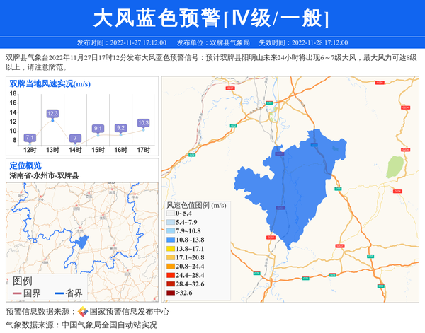 双牌县气象台2022年11月27日17时12分发布大风蓝色预警信号:预计双牌县阳明山未来24小时将出现6~7级大风,最大风力可达8级以上,请注意防范。 信息来源:国家预警信息发布中心; 发布单位:双牌县气象局。