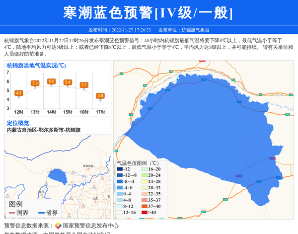 杭锦旗气象台2022年11月27日17时26分发布寒潮蓝色预警信号:48小时内杭锦旗最低气温将要下降8℃以上,最低气温小于等于4℃,陆地平均风力可达5级以上;或者已经下降8℃以上,最低气温小于等于4℃,平均风力达5级以上,并可能持续。请有关单位和人员做好防范准备。 信息来源:国家预警信息发布中心; 发布单位:杭锦旗气象台。