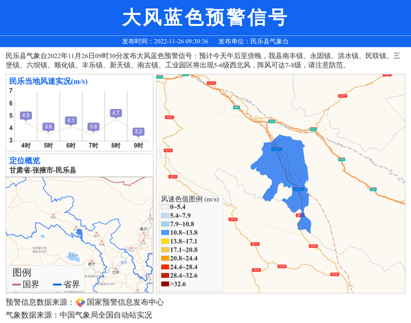 民乐县气象台2022年11月26日09时30分发布大风蓝色预警信号:预计今天午后至傍晚,我县南丰镇、永固镇、洪水镇、民联镇、三堡镇、六坝镇、顺化镇、丰乐镇、新天镇、南古镇、工业园区将出现5-6级西北风,阵风可达7-8级,请注意防范。 信息来源:国家预警信息发布中心; 发布单位:民乐县气象台。