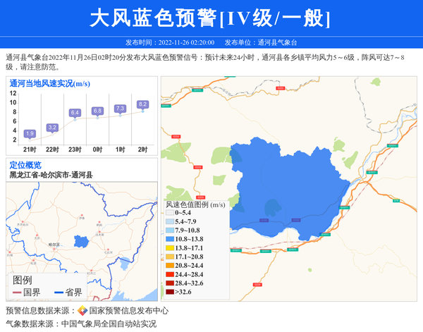 通河县气象台2022年11月26日02时20分发布大风蓝色预警信号:预计未来24小时,通河县各乡镇平均风力5~6级,阵风可达7~8级,请注意防范。 信息来源:国家预警信息发布中心; 发布单位:通河县气象台。