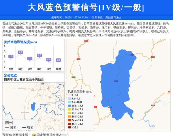 美姑县气象台发布大风蓝色预警信号[IV级/一般]