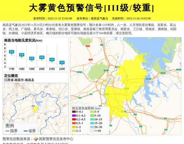 南昌县气象台2022年11月25日23时02分发布大雾黄色预警信号:预计未来12小时内,八一乡、八月湖街道办事处、东新乡、富山乡、冈上镇、广福镇、黄马乡、蒋巷镇、泾口乡、莲塘镇、南昌县银三角管理委员会、南新乡、三江镇、塔城乡、塘南镇、武阳镇、向塘镇、小蓝经济开发区、幽兰镇的部分地区可能出现能见度小于500米的雾,请注意防范。 信息来源:国家预警信息发布中心; 发布单位:南昌县气象台。