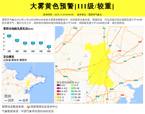 莱西市气象台2022年11月28日08时08分发布大雾黄色预警信号:目前我市水集街道、望城街道、河头店镇已经出现能见度小于500米的大雾天气,预计今天上午,我市部分镇和街道仍有能见度小于500米、局部能见度小于200米的大雾,请注意防范。 信息来源:国家预警信息发布中心; 发布单位:莱西市气象台。