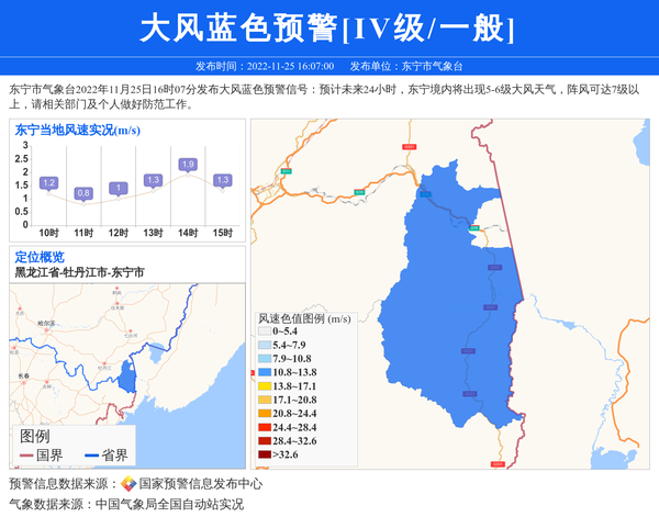 东宁市气象台2022年11月25日16时07分发布大风蓝色预警信号:预计未来24小时,东宁境内将出现5-6级大风天气,阵风可达7级以上,请相关部门及个人做好防范工作。 信息来源:国家预警信息发布中心; 发布单位:东宁市气象台。