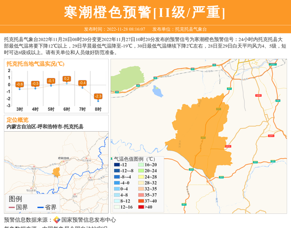 托克托县气象台2022年11月28日08时20分变更2022年11月27日10时20分发布的预警信号为寒潮橙色预警信号:24小时内托克托县大部最低气温将要下降12℃以上,29日早晨最低气温降至-19℃,30日最低气温继续下降2℃左右,28日至29日白天平均风力4、5级,短时可达6级或以上。请有关单位和人员做好防范准备。 信息来源:国家预警信息发布中心; 发布单位:托克托县气象台。