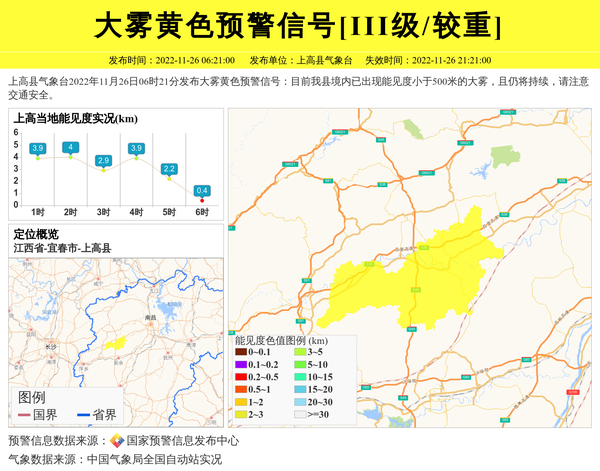 上高县气象台2022年11月26日06时21分发布大雾黄色预警信号:目前我县境内已出现能见度小于500米的大雾,且仍将持续,请注意交通安全。 信息来源:国家预警信息发布中心; 发布单位:上高县气象台。