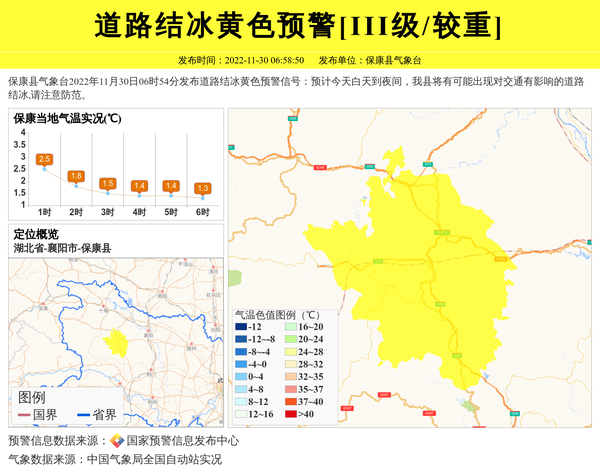 保康县气象台2022年11月30日06时54分发布道路结冰黄色预警信号:预计今天白天到夜间,我县将有可能出现对交通有影响的道路结冰,请注意防范。 信息来源:国家预警信息发布中心; 发布单位:保康县气象台。