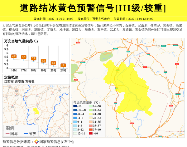 万安县气象台2022年11月30日21时44分发布道路结冰黄色预警信号:预计未来12小时内,百嘉镇、宝山乡、弹前乡、芙蓉镇、高陂镇、枧头镇、涧田乡、潞田镇、罗塘乡、沙坪镇、韶口乡、顺峰乡、五丰镇、武术乡、夏造镇、窑头镇的部分地区可能出现对交通有影响的道路结冰,请注意防范。 信息来源:国家预警信息发布中心; 发布单位:万安县气象台。