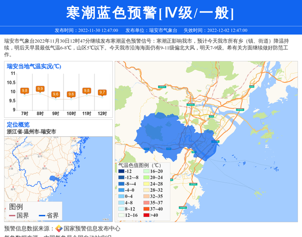 瑞安市气象台2022年11月30日12时47分继续发布寒潮蓝色预警信号:寒潮正影响我市,预计今天我市所有乡(镇、街道)降温持续,明后天早晨最低气温6-8℃,山区5℃以下。今天我市沿海海面仍有9-11级偏北大风,明天7-9级。希有关方面继续做好防范工作。 信息来源:国家预警信息发布中心; 发布单位:瑞安市气象台。