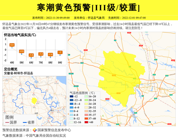 怀远县气象台2022年11月30日09时47分继续发布寒潮黄色预警信号。受强寒潮影响,过去24小时我县最低气温已经下降10℃以上,最低气温已降至0℃以下,偏北风力4级左右,预计未来24小时内寒潮对我县的影响仍将持续。请注意防范! 信息来源:国家预警信息发布中心; 发布单位:怀远县气象局。