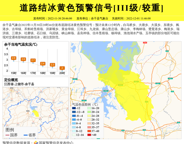 余干县气象台2022年11月30日20时46分发布道路结冰黄色预警信号:预计未来12小时内,白马桥乡、大塘乡、大溪乡、东塘乡、枫港乡、古埠镇、禾斛岭垦殖场、洪家嘴乡、黄金埠镇、江埠乡、九龙镇、康山垦总场、康山乡、李梅林场、鹭鸶港乡、梅港乡、瑞洪镇、三塘乡、社赓镇、石口镇、乌泥镇、峡山林场、县良种场、信丰垦殖场、杨埠镇、渔池湖水产场、玉亭镇的部分地区可能出现对交通有影响的道路结冰,请注意防范。 信息来源:国家预警信息发布中心; 发布单位:余干县气象台。